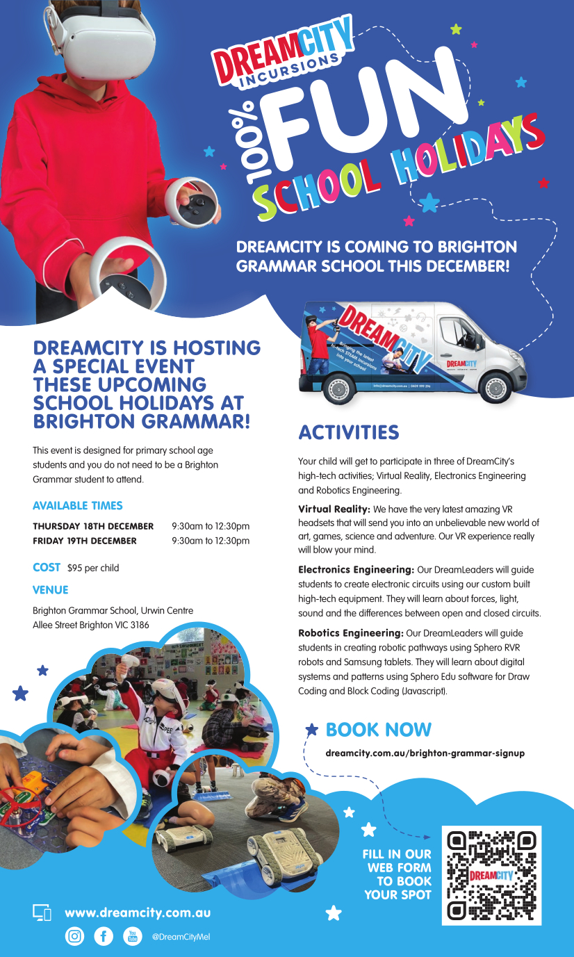 DreamCity offers high tech activities such as Virtual Reality, Neonatal nurse & Electronic Engineer programs run by expertly trained Educators who have experience with diverse learners, allowing children of all ages and skill levels to participate alongside each other in our engaging fun activities. Click here for more information and to book.